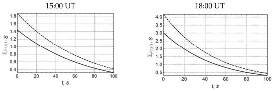 Figure 5 demonstrates that the perturbations of the integral ionosphere conductivities reach about 2 S for 15UT and 4 S for 18UT. At the same time, their relaxation time is about 40–50 s and somewhat less for 18UT, which is explained by the higher value of the background electron concentration.