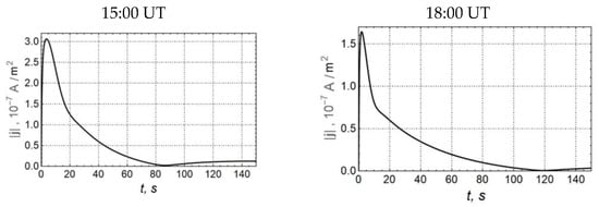 Figure 7). The duration of the current density pulse is 10 to 40 s, and it is longer for 18:00 UT, that is explained by the large values of the integral conductivities of the ionosphere.