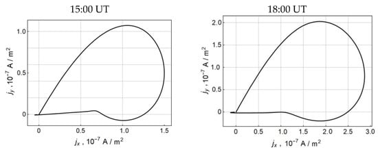 Figure 8 shows the hodograph vectors of the telluric current density at 15:00 UT and 18:00 UT.