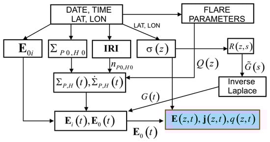 The code starts its operation upon receipt of the following initial data: date, time, and power of the solar flare. Based on these initial data the code calculates the subsolar point, and the background parameters of the ionosphere at altitudes of 100 and 140 km, the Pedersen and Hall conductivities, and also builds a model of the earth’s electric field according to Volland [