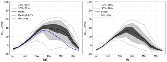 Long-term averaged monthly mean values of the intensity of the stratospheric polar vortex (SPV), zonal mean zonal wind along 60° N at 10 hPa [m/s] and its 10th, 30th, 70th, and 90th percentiles, according to the control experiment (a) and JRA-55 reanalysis data (b). The data for the control experiment are provided for 100 years, and the JRA-55 reanalysis data for the period [1958/59–2020/21].