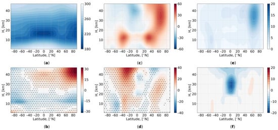 Winter (December–February) zonal mean temperature [K], (a), zonal wind [m/s], (c) and standard deviation of the zonal wind [m/s] (e) according to the control experiment and their difference with the winter (December–February) zonal mean temperature [K], (b), zonal wind [m/s], and (d) standard deviation of the zonal wind [m/s] (f) according to the reanalysis data JRA-55. The average values of the control experiment were calculated for 100 years, and for the JRA-55 reanalysis averaged period is [1958/59–2020/21]. Statistically significant differences at the 1% level (b,d) are marked with dots.