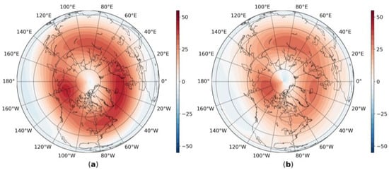 The intensity of the polar night jet is higher in the model data on the heights from the tropopause up to 35 km (Figure 2c,d). In addition, the model does not reproduce the quasi-biennial oscillations (Figure 2e,f) because this requires resolution in the lower stratosphere being no more than 1 km and the sufficiently strong forcing provided by the parameterized nonorographic gravity wave drag [64,65]. Note, however, that it is not our goal, as we aimed to analyze isolated SSTAs’ effect on the stratospheric dynamics, and parameterized gravity wave drag is not included in our Isca configuration.