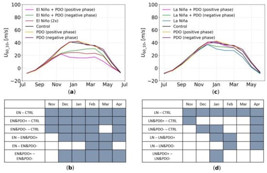 First of all, we analyzed the influence of various SST anomalies on the SPV intensity quantified by U60_10. In the “single” experiments with SST anomalies corresponding to the PDO phases (PDO+ and PDO−), there are no statistically significant differences in the SPV intensity with the control experiment data (Figure 4a,c).