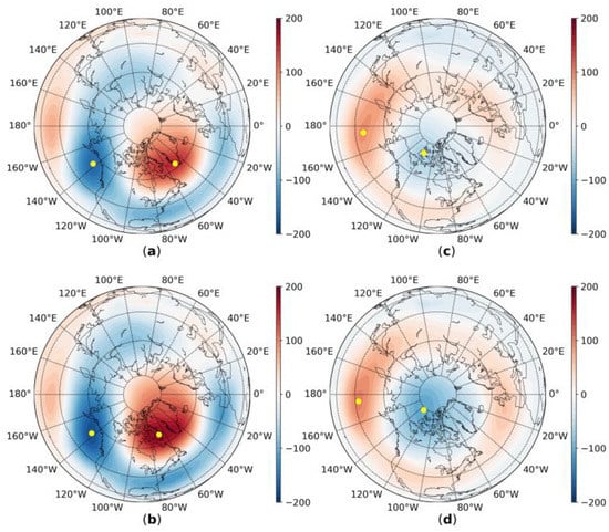 Differences of winter (December–February) geopotential heights for the surface 850 hPa between (a) EN and the CTRL experiments, (b) LN and the CTRL experiments, (c) EN&PDO+ and the CTRL experiment, and (d) LN&PDO− and the CTRL experiment, [m]. The position of the maximum absolute values of the hgt anomalies are marked by yellow dots.