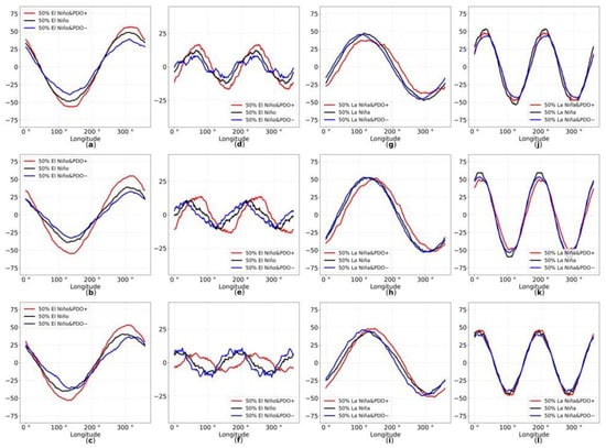 The 50th percentile of the phases and amplitudes of wave 1 in December (a), January (b), and February (c) and wave 2 in December (d), January (e), and February (f) along 60° N at 500 hPa in the EN experiment (black), EN&PDO+ (red), and EN&PDO− (blue) calculated over 99 model years. The 50th percentile of the phases and amplitudes of wave 1 in December (g), January (h), and February (i) and wave 2 in December (j), January (k), and February (l) along 60° N at 500 hPa in the experiments LN (black), LN&PDO+ (red), and LN&PDO− (blue) calculated over 99 model years.
