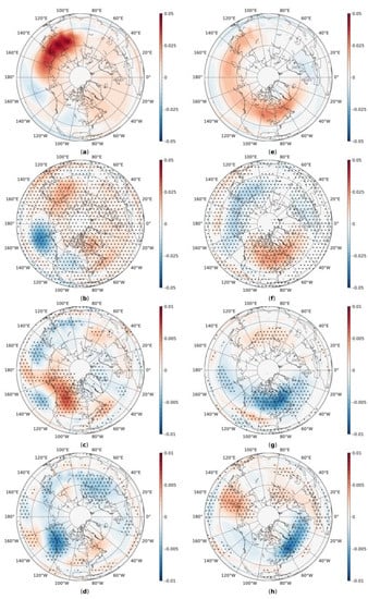 Figure 7c,d shows that the combination of the El Niño and the positive phase of the PDO (EN&PDO+) is characterized by an intensification of the waves’ activity vertical propagation over the western part of Canada and over the Urals, while, in the combination of the El Niño and the negative phase of the PDO (EN&PDO−), the effect is the opposite.