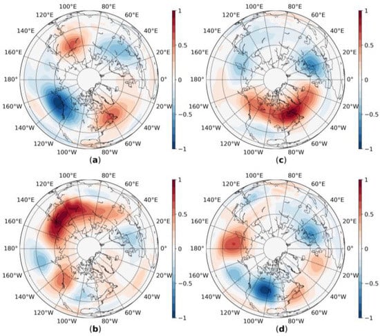 Figure 8 shows the first and second empirical orthogonal functions of the vertical component of the Plumb flux (first and second EOF Fz) at 100 hPa level for the “single” EN and LN experiments. The spatial distribution of the first EOF Fz during the El Niño corresponds to planetary wave 2 and explains up to 23% of the waves’ activity vertical flux variability (Figure 8a), while the second EOF corresponds to wave 1 and explains up to 17% (Figure 8b). In the La Niña events, the situation is the opposite: the first EOF Fz (28%) corresponds to wave 1 (Figure 8c), and the seco EOF Fz (15%) corresponds to wave 2 (Figure 8d).