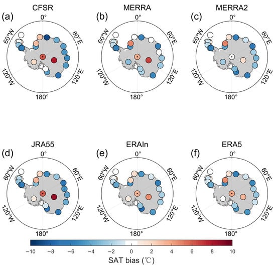 The biases of reanalysis datasets for the Antarctic surface air temperature during 1979–2020. (a–f) are for CFSR (a), MERRA (b), MERRA2 (c), JRA55 (d), ERA-Interim (e) and ERA5 (f), respectively.