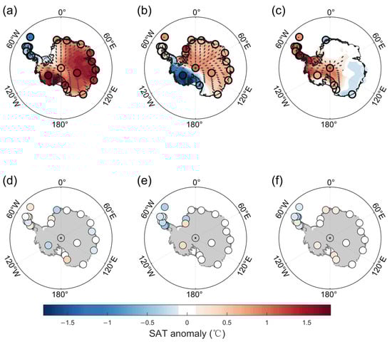 We further evaluated the difference in Mode3, with a focus on the stations over the Antarctic Peninsula for austral autumn (MAM). As shown in Figure 10 a–f, in all reanalyses, the SAT patterns associated with Mode3 showed a positive deviation over most of the stations on the west coast, but a negative deviation on the east coast. We further illustrated the surface wind pattern associated with Mode3 for all reanalysis datasets (Figure 10g–l). The results show that the SAT pattern over the Peninsula region is tightly associated with an anti-cyclonic circulation pattern, with a surface wind blowing across the Peninsula from the west to the east coast (Figure 10g–l).