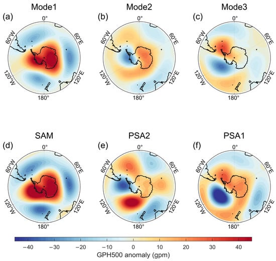 We further retrieved the atmospheric circulation patterns associated with the above Antarctic SAT modes by regressing the GPH500 against the time series of the first three CMCA modes (Figure 3a–c). We then compared them with the classic atmospheric circulation patterns over the southern hemisphere, namely the SAM (Figure 3d), and the first (Figure 3f) and second (Figure 3e) PSA modes (see Method). The circulation patterns associated with the first three SAT modes showed strong coherency with these classic atmospheric circulation patterns (Figure 3).