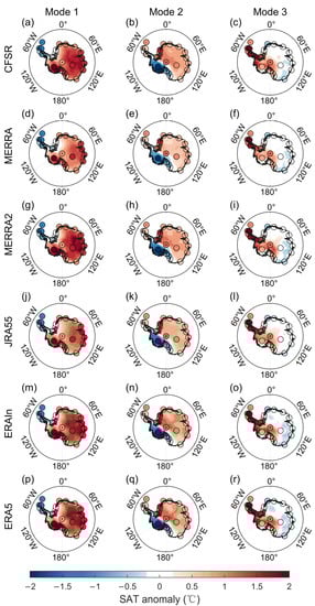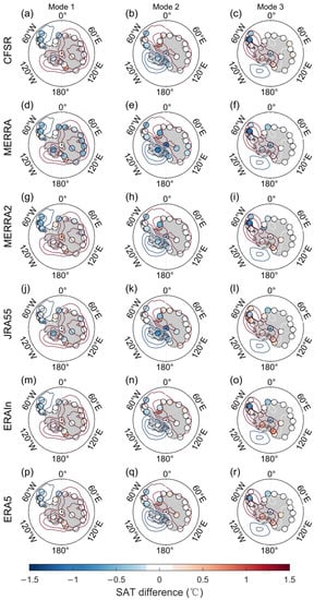 We further evaluated the reanalysis datasets’ ability to reproduce the observed SAT variability according to the retrieved CMCA modes. Although previous studies revealed strong disagreement among different reanalyses, as well as between the reanalyses and in situ observations, our study indicated that the six reanalyses represent the main features of the leading CMCA modes well, compared to the observations.