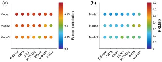 To evaluate the consistency between the spatial patterns of the reanalyses and observations in each mode, we calculated the ratio of the root mean square deviation (RRMSD) of these spatial patterns. The RRMSD is defined as