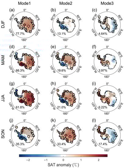 Nevertheless, the regional features of each mode slightly differ for different seasons. In the CMCA decomposition for austral spring (SON), the order of the first (Figure 7j) and the second (Figure 7k) modes are switched, with the first mode representing the East–West Antarctic seesaw pattern (with the represented covariance of 35.3%) and the second representing the continental warming/cooling pattern (33.4% of covariance). This difference indicates that the thermal advection induced by the PSA2 pattern may contribute more to the Antarctic SAT variability in austral spring (SON). In the continental mode (Figure 7a,k) for austral summer and spring, the continental-wide warming/cooling anomaly is relatively weaker than the other two seasons, with the spot of cooling/warming signal around the Antarctic Peninsula disappearing. In addition, the seesaw and dipole SAT modes (Mode2 and Mode3, Figure 7b,c) for austral summer (DJF) are relatively weaker than those in other seasons, partly due to the weakened Rossby wave dynamics in the summer hemisphere [19,29].