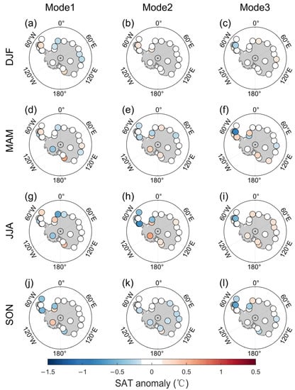 We further quantified the deviations in each CMCA mode for all four seasons by calculating the difference between the reanalysis modes and the observations (Figure 8). The difference in most of the CMCA modes is negligible, with the absolute value of the deviations being less than 0.2 °C in most Antarctic stations. However, for the stations around the Antarctic Peninsula, several CMCA modes showed strong deviations for different seasons (Figure 8c,f,h,i,l). In particular, the deviation over the Antarctic Peninsula in Mode3 was relatively larger than that in the other two modes. The largest difference, reaching −0.96 °C, between the reanalyses and observational modes appeared at the Marambio station for austral autumn (MAM, Figure 8f), which is located on the east coast of the Antarctic Peninsula. Two stations (the Faraday and San Martin stations, Figure 8f) on the west coast of the Peninsula show positive deviations of 0.57 °C and 0.37 °C, respectively.