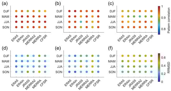 The pattern correlation (PatCor) coefficients and RRMSD of reanalysis and observational spatial patterns at the station locations for the leading three modes for each season. (a,d) show the pattern correlation and RRMSD for the first mode. (b,e) and (c,f) are same as (a,d), but for the second and third modes, respectively.