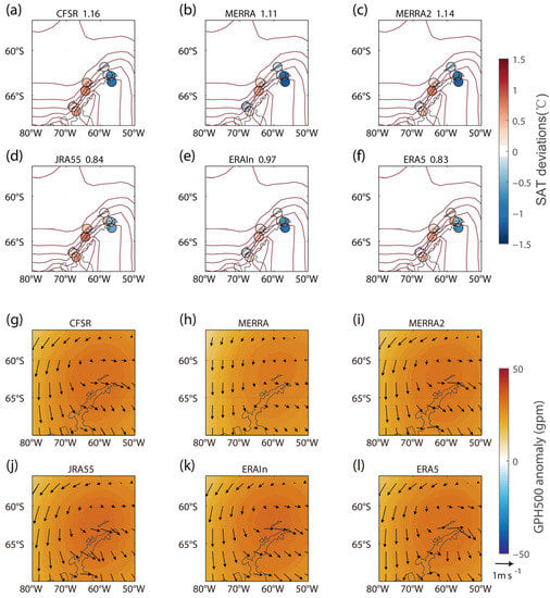 Previous studies indicated that the regional temperature variability around the Antarctic Peninsula is highly influenced by the Foehn wind [9,45,46,47]. The Foehn wind is induced by the adiabatic heating at the lee slope of the Trans-Antarctic Mountains, which contributes to the steep topography over the Antarctic Peninsula [45,47]. However, as they are limited by the spatial resolution, most reanalysis datasets cannot resolve this steep topography over the Antarctic Peninsula, and thus may underestimate the effect of the adiabatic wind, leading to an opposite sign for the deviation between the east and west coast (Figure 10a–f).