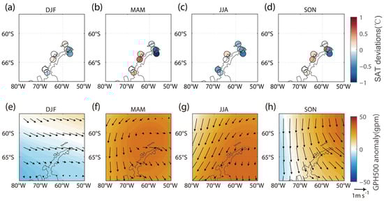 We further evaluated this opposite sign of SAT deviation between the east and west coast of the Peninsula for other seasons (Figure 11). This deviation is relatively stronger for austral spring (Figure 11d) and autumn (Figure 11b), largely due to the stronger wind anomaly across the Peninsula (Figure 11h,f) for these two seasons.
