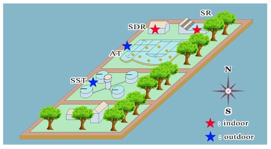 Bioaerosol have been measured in many different environments (especially working environments), showing high health risks to workers []. For example, previous research in Poland showed that employees’ hands and masks were frequently exposed to germs linked to biomass during routine work []. Madsen et al. reported that the source of microbial exposure can be moldy seeds, a biopesticide, and fungi on building materials []. Numerous studies have suggested that wastewater treatment plants (WWTPs) are a typical point source of hazardous, infectious bioaerosol emissions [,,,]. For instance, WWTPs may release specific airborne pathogenic bacteria, such as fecal coliform, E. coli, and Enterococcus, that cause respiratory illnesses, including asthma and chronic bronchitis []. Such pathogens pose serious health risks to occupational workers and the residents of surrounding communities [,].
