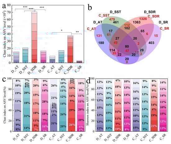 Size distributions at different sampling sites. (a) Chao indices in Plant C and Plant D. (b) Venn diagram based on ASVs, black font for Plant C and red font for Plant D. (c,d) Proportion of Chao and Shannon indices at each size stage. AT: aeration tank; SST: secondary settling tank; SDR: sludge dewatering room; and SR: screen room. Stage I–VIII: color from dark to light; * significance at 0.05 probability level, ** significance at 0.01 probability level, *** significance at 0.001 probability level.