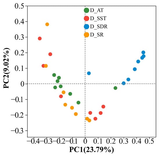 PCoA using unweighted UniFrac distances matrix to calculate Plant D samples. AT: aeration tank; SST: secondary settling tank; SDR: sludge dewatering room; SR: screen room; D: Plant D.