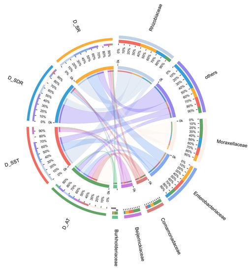 Circos plots exhibit the species composition of Plant D at the top 95% of family level of relative abundance in distinct treatment units. D_AT: aeration tank of Plant D; D_SST: secondary settling tank of Plant D; D_SDR: sludge dewatering room of Plant D; and D_SR: screen room of Plant D.