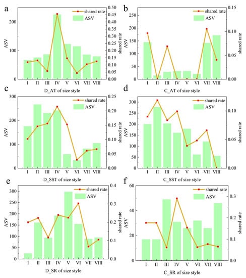 ASV in size distribution and shared rate of ASVs from aerosol and wastewater. (a) D_AT (aeration tank of Plant D), (b) C_AT (aeration tank of Plant C), (c) D_SST (secondary settling tank of Plant D), (d) C_SST (secondary settling tank of Plant C), (e) D_SR (screen room of Plant D), (f) C_SR (screen room of Plant C). I–VIII: from the first to the eighth particle-size stages.