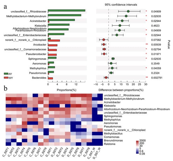 The differences in community composition between wastewater and aerosols were compared by Wilcoxon rank sum test on genus level. Figure 6a showed that 11 genura of the 15 most abundant genus were distinctly different (p < 0.05) between wastewater and aerosols in SST. Similar differences were found for the SR (10/15 in Figure S8a) and AT (6/15 in Figure S8b). The heat map was used to explore in-depth the differences in the composition of the dominant bacteria between wastewater and aerosols. In the SST, the dominant genera wastewater was unclassified_f_Comamonadaceae (4.91%, Plant C) and norank_f_norank_o_Chloroplast (7.91%, Plant D), respectively; the dominant genera of aerosols were Methylobacterium-Methylorubrum (59.82–32.78%), unclassified_f_Rhizobiaceae (45.97–31.72%), and Acinetobacter (32.05–22.01%) (Figure 6b). Similar results were recovered for wastewater and bacterial aerosols for the AT and SR (Figure S9a,b). The above results show that the dominant bacterial genera in the wastewater had low relative abundance in the aerosols, while the dominant bacterial genera in the aerosols had low relative abundance in the wastewater.