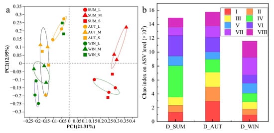 The alpha diversity indices for the amplicon sequence variants (ASVs), including observed ASVs, the Chao1 index, and the Shannon index, were calculated with Mothur v1.30.1 []. The similarities among the microbial communities from various samples were visualized using principal coordinate analysis (PCoA) based on Bray–Curtis and unweighted UniFrac dissimilarity values using the Vegan v2.5-3 package in R []. The percentage of variation explained by treatment and the corresponding statistical significance were determined using the permutational multivariate analysis of variance (PERMANOVA) test, as implemented in the Vegan v2.5-3 package in R. The linear discriminant analysis (LDA) effect size (LEfSe) (http://huttenhower.sph.harvard.edu/LEfSe, accessed on 21 October 2021) was performed to identify the taxa that were significantly characteristic of each period [] (LDA score > 4, p < 0.05).