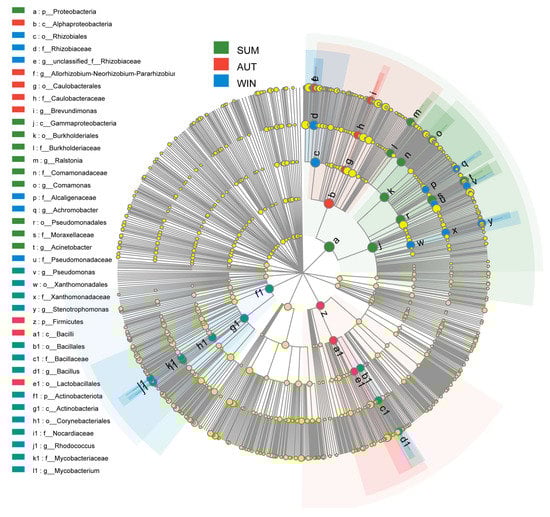LEfSe analysis indicates the distinct taxonomic units of bacteria in various seasons. Differently colored areas represent distinct components (red for autumn, green for summer, and blue for winter), and the diameter of each circle is proportional to the relative abundance of that taxon. The inner to outer circles correspond to the phylum to genus hierarchy. SUM: summer; AUT: autumn; WIN: winter.