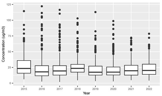 The investigated PM daily concentrations were sampled at the same location as the starting point for atmospheric-sounding. PM concentrations were assessed as daily mean values measured with the reference method [40] that comprise active sampling and subsequent gravimetric analyses in the ARSO chemical–analytical laboratory. We focus on PM measurements from 2015 to 2022. Figure 1 shows the measured PM concentrations for different years and Figure 2 shows the distributions of the concentrations for different months. In this paper, when we discuss high and low PM concentrations, we refer to Figure 2. The investigated PM concentrations were also provided by ARSO. Table 1 shows the number of pairs of temperature profiles and PM concentrations available for each month while Table 2 shows the available pairs for each year. In total, we used 2197 clustered temperature profiles.