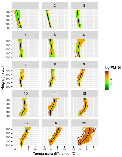 The main conclusions from the cluster analysis were in line with the related work about the relationship between temperature inversions and PM concentrations [1,7,10,11,12,14]. Morning surface temperature inversions are associated with high PM concentrations (depicted in red and orange in Figure 3 and Figure 4, which corresponds to approximately above 40 μg/), especially in the winter. The strongest temperature inversions (cluster 15; corresponding to approximately a temperature difference of 8 at 750 m) were present only in the colder months and were rare. The most representative temperature profiles in Ljubljana showed decreasing temperatures with the altitude (mixed atmosphere). These profiles are associated with the lowest PM concentrations (around 10 μg/). Such situations are common year-round (not only in the summer). Morning temperature inversions in the summer are not associated with high PM concentrations probably because of lower summer PM emissions. The conclusions are in line with other studies on air pollution in Slovenia [33].