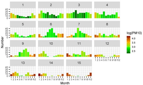 The relationship between concentrations and seasons can be observed in Figure 4. Winter months have higher concentrations regardless of the temperature profiles. The lowest PM concentrations are measured during the summer and spring months (see Figure 2 for typical summer and spring concentrations) when the atmosphere is well mixed. Trajectories with decreasing temperature profiles (clusters 1–4) are common throughout the year and are typical for unstable weather conditions (wind, rain). However, such profiles are more frequent in the summer. On the other hand, clusters 6, 7, and 9 depict very stable situations or elevated inversions, which are more common in the summer. These profiles are linked to much higher concentrations in the winter than in the summer, likely due to increased PM emissions in the winter, which agrees with observations from Poland [17]. The strongest inversions are present mostly during the winter months (clusters 14 and 15), and weaker temperature inversions are more frequent in autumn and spring (clusters 10, 12, and 13). Clusters showing temperature inversions are not observed in the summer; the ones in Figure 4 are most likely a result of undetected outliers in the data. The early morning temperature inversions are common also in the warmer months, but they are more commonly elevated inversions, not strong, and break up easily, so they are not associated with high PM concentrations. Similarly, Xu et al. [4], Huang et al. [18] found that surface inversions were typical for winter months, while elevated inversions were more common in the summer months in two cities in the north of China.