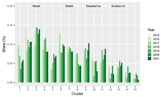 The cluster occurrence analysis of different years enabled us to estimate if there was a trend in the occurrences of temperature profiles. With the help of Figure 5, we were able to confirm the hypothesis that the predominant shapes of the temperature profiles do not differ substantially between different years in the observed period.