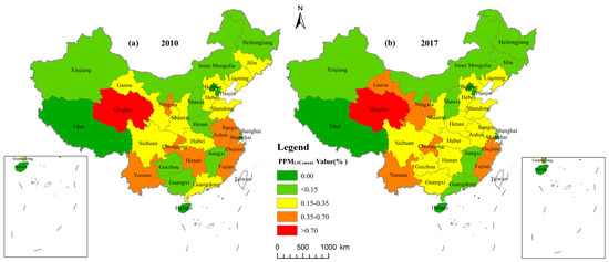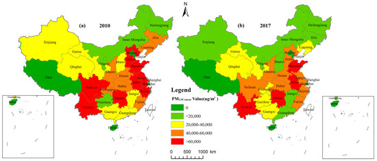 The annual total PM2.5Cement value was 1.40 × 106 µg/m3 in 2010 and 0.98 × 106 µg/m3 in 2017 for the study areas, which was decreased by 30.31%. The PPM2.5Cement decreased from 0.24% in 2010 to 0.21% in 2017. Spatially, the high annual PM2.5Cement were concentrated in the east and southwest (Figure 1a), and the high PPM2.5Cement measures were mainly found in the central region, western and eastern provinces, and Qinghai Provinces (Figure 2a) in 2010. Interestingly in Qinghai provinces, although its PPM2.5Cement value was the highest (1.22%, 1.35%) in all provinces in the two years, the annual PM2.5Cement was only 23,463 µg/m3 in 2010 and 20,115 µg/m3 in 2017, and it ranked 18th in the 31 study regions (Figure 4). Then I used the annual PM2.5Cement value to range segmentation. In 2010, there were eight provinces with PM2.5Cement > 60,000 µg/m3, including Hunan (PM2.5Cement, 20,152.8 µg/m3, PPM2.5Cement, 0.56%), Anhui (17,247.2 µg/m3, 0.55%), Jiangsu (85,846 µg/m3, 0.40%), Zhejiang (76,522.03 µg/m3, 0.68%), Sichuan (73,124.01 µg/m3, 0.21%), Shandong (68,368µg/m3, 0.18%), Yunnan (63,530 µg/m3, 0.38%), Hebei (60,344 µg/m3, 0.20%); in seven provinces, the PM2.5Cement was between 40,000–60,000 µg/m3, which can be ordered as follows: Hubei, Shanxi, Liaoning, Fujian, Jilin, Henan, Chongqing. The area with an annual PM2.5Cement between 20,000–40,000 µg/m3 covered seven provinces, which can be ordered as follows: Guangxi, Guangdong, Gansu, Jiangxi, Shanxi, Xinjiang, Qinghai. Provinces with an annual PM2.5Cement value between 0–20,000 µg/m3 included Inner Mongolia, Guizhou, Ningxia, Heilongjiang. Provinces with the lowest the annual PM2.5Cement value were Beijing, Shanghai, Tianjin, Hainan province, and Tibet Autonomous Region (Figure 1a and Figure 2a).