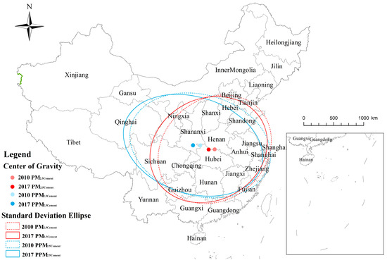 The standard deviation ellipse and gravity center migration for PM2.5Cement and PPM2.5Cement during 2010 and 2017.