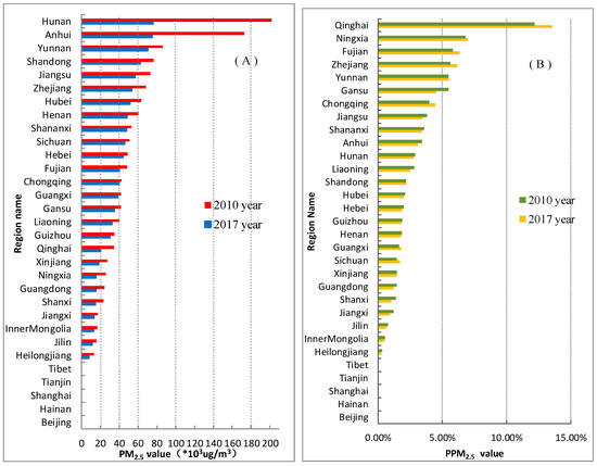 The annual PM2.5Cement value (A) and PPM2.5Cement value (B) of each province in the study area in 2010 and 2017.