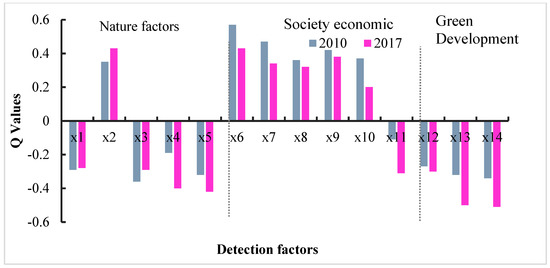 The geographic detector model analysis on the contribution of each single factor to regional PM2.5Cement. x1…x14 were the 14 factors for natural, society economical, and green development aspects in Table 1.
