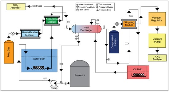 To measure CO2 concentration at the exit of the tube side on the absorber, a solid-state IR-based CO2 analyzer (model 906, Quantek, Grafton, MA, USA) with a low resolution was used. On the stripper side, helium gas was passed through the bore of the stripping module to remove and collect the stripped CO2 from the CO2-loaded absorbent; the exiting gas containing stripped CO2 in helium was subjected to a controlled vacuum by a vacuum pump, and a vacuum regulator by referring an alternative method for the stripping process []. Its CO2 concentration was measured by another Quantek CO2 analyzer [].