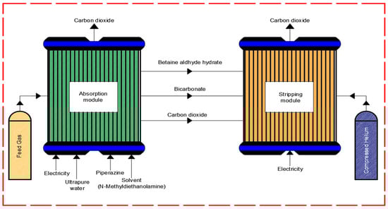 To reduce the influence of energy-based environmental problems, which are among the most significant issues of the 21st century and directly affect most countries’ economies and people’s lives, some effective approaches, such as improving energy efficiency, promoting energy conservation, increasing the use of low-carbon fuels, developing renewable energies, adopting geoengineering approaches such as afforestation and reforestation, and investigating carbon capture and storage (CCS) technologies, are being taken into account by decision-makers [,,]. Among them, CCS which consists of the processes of capture, transport, and long-term storage of CO2, and has been used since 1920 for commercial purposes, is a promising method to separate CO2 from a gas mixture in the flue gas emitted from power plant emissions to mitigate CO2 emissions in the atmosphere. This method requires high CO2 storage capacity [,,,]. CCS technologies are commonly divided into three groups: pre-combustion, post-combustion, and oxy-fuel combustion [,]. Post-combustion CO2 capture stands out among other technologies and is more widely preferred, as it can be easily integrated into the existing facilities of many different industries such as power plants, the chemical industry, and the fuel, iron and steel, and cement industries [,]. In post-combustion CO2 capture, amine scrubbing, adsorption, cryogenic distillation, and membrane processes are the most preferred techniques [,,,]. Among these technologies, the most mature amine-based CO2 capture absorption process results in the highest removal efficiency to separate CO2 from flue gas in conventional gas-liquid contactors, but it requires high energy demand and increases environmental concerns based on the use and generation of toxic materials during the solvent production used in the chemical absorption [,]. Hence, alternative CO2 capture strategies consisting of absorption using novel solvents, such as ionic liquid, calcium looping, adsorption based on materials, such as zeolites, metal–organic frameworks, carbon nanotubes, and activated carbons, and membrane technologies are being studied to replace the conventional technology based on absorption with amines [,].