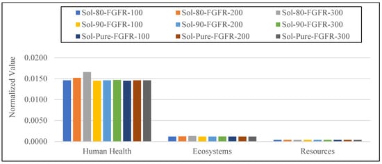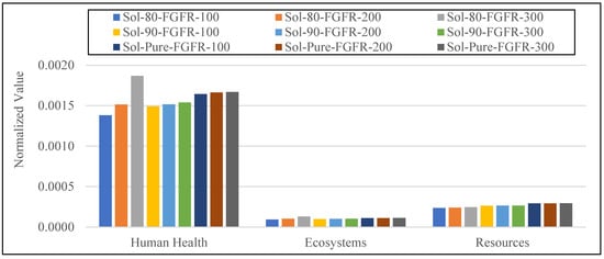 Normalized values of the damage categories for the absorption process at both the three different solvent concentrations, and FGFRs when LFR, SHFR, and VSS were 15.10 L/h, 50 cm3/min, and 2.54 cm Hg, respectively, for all cases. The symbol Sol-80-FGFR-100 stands for solvent (Sol) concentration at 80 vol% aMDEA/20 vol% H2O and feed gas flow rate (FGFR) at 100 cm3/min.