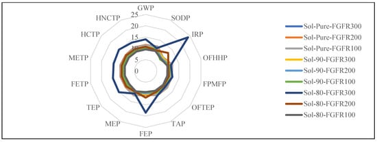 Absolute values of the impact categories at three different LFRs, and solvent compositions when FGFR, SHFR, and VSS were 300 cm3/min, 100 cm3/min, and 2.54 cm Hg.