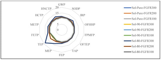 In the stripping membrane contactor, TEP revealed a remarkable effect among other endpoint impact categories (see Figure 6). Terrestrial ecotoxicology can be considered as a study related to the impacts of environmental pollutants like pesticides on living organisms including soil microbes, invertebrates, plants, amphibians, reptiles, birds, and mammals in a terrestrial environment like agricultural soil [,]. The considerable impact observed in TEP for the lowest solvent concentration and the highest FGFR can be associated with high CO2-loaded solvent at the stripper.