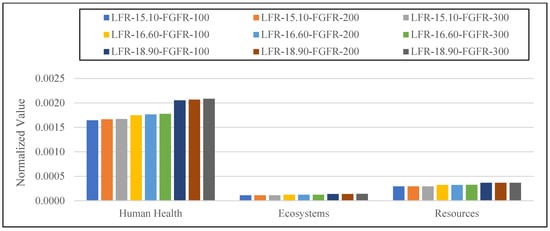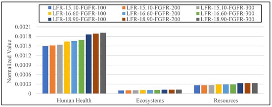 Normalized values of the damage categories for the stripping process at both the three different LFRs, and FGFRs when solvent concentration, SHFR, and VSS were 90 vol% aMDEA/10 vol% H2O, 50 cm3/min, and 2.54 cm Hg, respectively, for all cases.