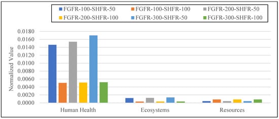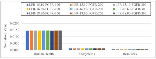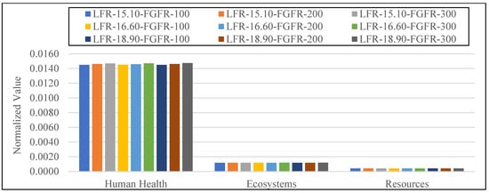 Normalized values of the damage categories for the stripping process at both the three different LFRs, and FGFRs when solvent concentration, SHFR, and VSS were pure, 50 cm3/min, and 2.54 cm Hg, respectively, for all cases.