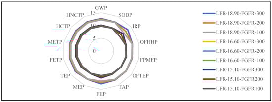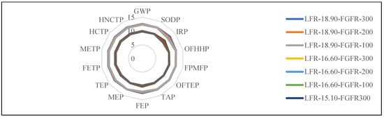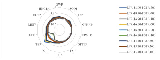 The human toxicity potential was mentioned for the first time by Guinée and Heijungs (1993) [] to express the potential harm of a compound released into the environment on public health [,]. Human toxicity is used to weigh emissions inventoried as a part of an LCA by evaluating their impacts, such as carcinogens and non-carcinogens []. For the human toxicity impact category including HCTP and HNCTP, the results show that the highest LFR has the highest environmental impact because of the toxic byproducts produced during the manufacturing of solvents used in the experiments. When damage categories are evaluated in terms of impact in stripping processes, the impact of LFR change on resources is much lower than the impact on the ecosystem. Here, it can be said that the effect observed in the ecosystem is similarly related to OFTEP, TAP, FEP, MEP, FETP, and MEP, but TEP is slightly more effective (see Figure 10).