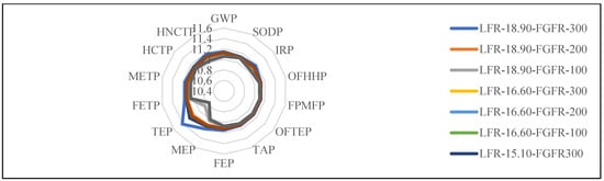 Terrestrial acidification resulting from the atmospheric deposition of acidifying compounds like nitrogen oxides (NOx), ammonia (NH3), and sulfur dioxide (SO2) as a result of human activities brings about direct and indirect severe impacts on ecosystems [,,]. The increase in nitrogen and sulfur deposition leads to a decrease in the soil’s solution pH that triggers some negative consequences in terrestrial ecosystems, such as the extinction of some plant species, and alterations in biotic community structure and composition [,]. The results in the present study for the terrestrial acidification impact category exhibit an increasing trend in SO2 equivalents concerning increasing LFR for both two processes.