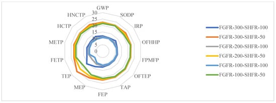 Since some organisms living in estuarine and coastal zones are more sensitive than freshwater organisms towards environmental contaminants, such as surfactants that can give rise to irreversible long-term impacts due to their accumulation in remarkable concentrations, marine environments are considered sensitive ecosystems []. In the current study, the highest effect on METP was observed under the condition with the maximum FGFR and the minimum SHFR (see Figure 16).