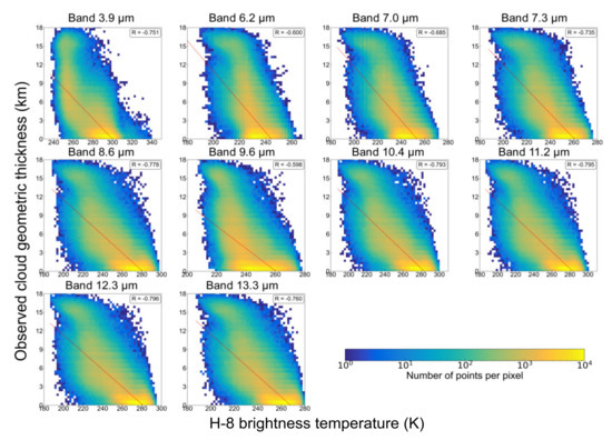 Scatter plots of H-8 infrared band vs. cloud geometric thickness.