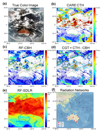 Spatial features of the H-8 full-disk cloud geometric properties and SDLR on September 1, 2018: (a) bands 3, 2, and 1 for RGB of the H-8 true color image; (b) CARE cloud top height product; (c) H-8 cloud base height derived using the RF models; (d) cloud geometry thickness derived from the difference between CTH and CBH; (e) H-8 SDLR derived using the RF models; and (f) spatial distribution of radiation stations from four networks (BOM, GTMBA, BSRN, and NMC) used to validate the performance of the estimated SDLR. Different symbols stand for various networks.